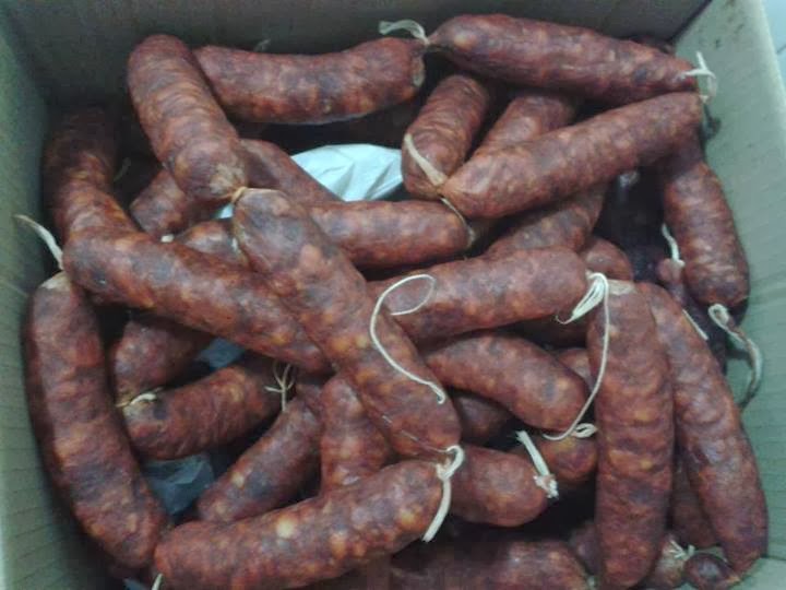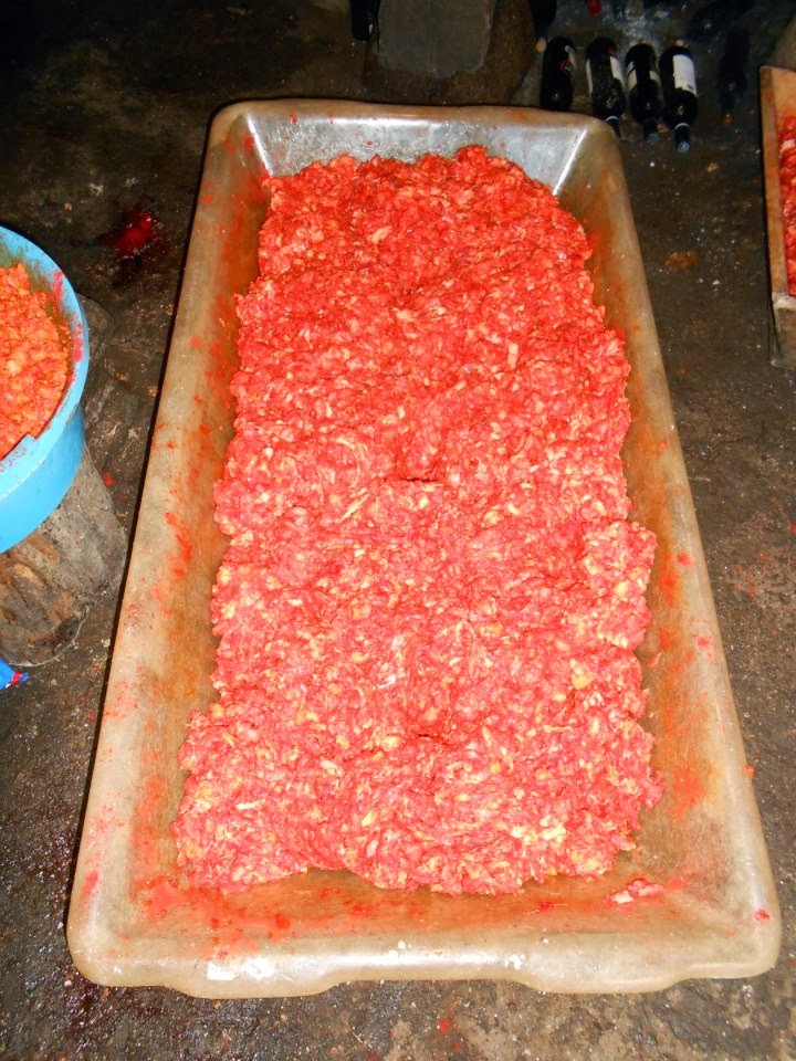Les jeunes de la maison se chargent de distribuer, quelque chose de foie et viande entre quelques voisins.On effectue entretemps ce despiece le reste de la famille coupe dans des bandes, la viande destinée à des chorizos, la pique dans une machine de bielle et en la déposant dans une cuvette de bois, pour procéder à sa marinade, en lui ajoutant un mélange de poivron doux et piquant, origan et sel, en l'ayant veillé à ne pas être passé avec le sel et en mélangeant tout avec les mains, en lui donnant retour pour que le mélange soit homogène.