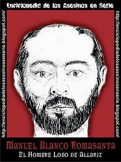 Count our ancestors, that when was small and not they carried or or they moved away much of house, their parents said to them that the Man would come "from Saco" or "the sacamantecas" and would take them with him and although nobody knew that man, single with mentioning it the children felt completely terrified, obeying to the greater ones, by the fear to that a monstrous man with an enormous coat to his backs took them for always and made them disappear, to remove tripas.Hoy to them, we know that those infantile fears really were their right to be, because that story has a part of legend and another one starts off real and authentic, since in Galicia and very cerquita of Xares, had sacamantecas that it assassinated to children to extract of corpses leaves from fat, because a belief existed that that said some serious disease could cure if were used as cataplasm on herida.La legend of the sacamantecas became popular at the end of century XIX and principles of the XX, by the popular belief that, as much the wheels of the cars as those of the mills and the machines to steam they had to be smeared with grease quite often so that they worked perfectly, being created the rumor that the best lubricant was the tender human fat, because the animal was not so dense and it would not cause the same yield, reason why to satisfy this demand of human fat one thought that sinister men roamed by the street, with coats in the shoulder, that they kidnapped to the children and they assassinated them to soon sell them to a desollador, that was in charge to extract the butters, paying to the kidnappers a great amount of money by each boy that brought to them, extending east myth in Spain when the new railroads started up and began to enter some disappearances of children in Barcelona. Soon the rumor that ran it was not a chance and that were some sacamantecas by the environs that had raptado to the children, of comes the fame there from the sacamantecas to scare the children. One of the personages who have been denominated like true Sacamantecas, was called Juan Diaz de Garayo, and committed its crimes in Álava during nine long years at the end of century XIX before being captured and condemned until death and his nickname it was given to him to assassinate six women (who are the deaths which they were possible to be proven), although thinks that there were many more victims, to that extrangulaba with their own hands and desagarraba the belly with cuchilo of mount, which turns to him the second assassin in Spanish series, after its predecessor White Manuel Romasanta, "the man wolf of Allaríz". White Manuel Romasanta, was born in Regueiro, in the province of Ourense, the 18 of November of 1809 and died in 1854. At first the birth game put Manuela, since it thought that she was a girl, until to the 6 years the doctor of the town, them coat of doubts and I advise to them that they put Manuel to him, confusion that dragged during all its childhood, because in the school they made fun of of him, since a year the following year represented the paper of Maria in the scholastic Bethlehem and the one of San jOse. After leaving the school Ramon Romasanta puts itself to the service of his uncle Lopez, who teaches the tailor profession to him dealing it with amiability, educating and teaching to him to the manufacture of soaps and perfumes to him. Nevertheless, something called the attention of Manuel and was the fact that the days of Full Moon his uncle disappeared and returned with the full body of scratches and bites, reason why whenever his nephew asked porqué to him of those wounds, was limited to answer to him "Is thing of witches", but the curiosity of Manuel, decided to discover as it was the secret that as much tied down its uncle, reason why waited for the following full moon and it left after him. After awhile going into in the mount it observed as it entered a natural cave, waited for minutes it go and when seeing that it did not happen anything, it entered sigilosamente without doing noise, feeling horrified the presence of a viscous being and cold that defied the laws of naturaleza.Después to leave to its uncle Ramon, Manuel is offered as guide of ways, since its knowledge of mounts were prodigious, until one moon-lit night full, accompanied a woman and to his son of seventeen years, they had made a rest to sleep and it was being on duty nocturnal, when multiple hairs appeared of his body and he was able to lick itself in sites where a human being could not and to ease up to sleep he had to give three returns on if same. That same day watched to his victimas when they were slept and the despedazó.Era a physically normal man, of about 43 years, very under since it measured 5 feet less than one inch (what translated to meters he would be 1´37), of brown complexion, clear brown eyes, hair and black and abundant beard and calvo.Su appearance was not does violence to nor repugnant, when not having characteristic characteristics, its glance was sweet and timid, being able to become ferocious and arrogant or forzadamente calm, its temperament was bilious and its corporal development was pronounced regularly within his limited stature. Apparently it enjoyed good health. Between the most remarkable characters, they emphasize a rebound not very considerable of the escamosa portion of the weather, as well as a face angle of 82 degrees of opening by effect of the swelling of the pronouncing enough frontal sines. Its craneal oval measured 22 inches (50.6 cm.), the oval of the face is of 23, 9 inches (54.9 cm.), the mastoides apophysis presented/displayed an arc of 9 inches (20.7 cm.) and of the dental arc of the forehead this study went 6 inches (13.8 cm.).De could be made a picture robot of the "Man Wolf of Allariz". A face, made to the charcoal that shows the calm glance but moving of whom a sagacious person and very prepared for that time could have been White Manuel Romasanta.Era, wise person to read and to w
