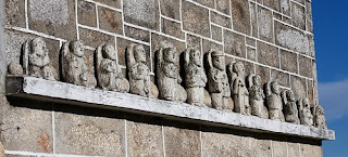 En el muro de la escalera de subida a las campanas hay un escudo tallado en piedra, que se asegura en el pueblo que recuerda a la familia "Casa Lamela de Quiroga", que tuvo el protectorado de la parroquia hasta el primer tercio del siglo XX.